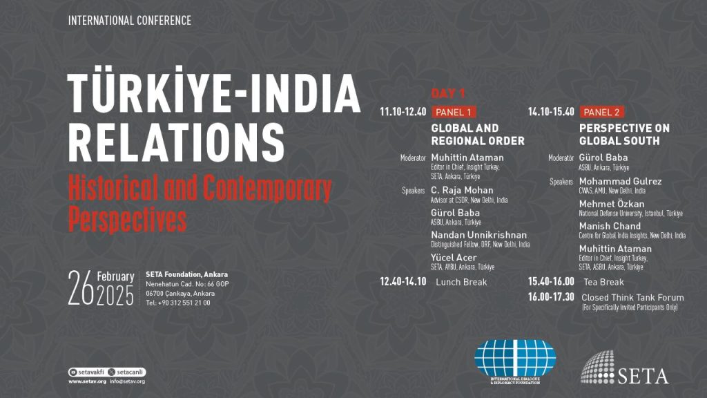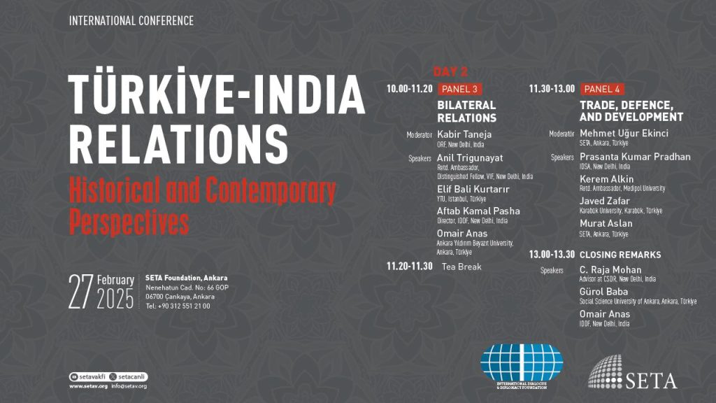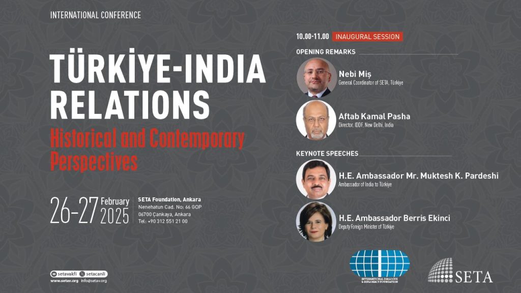 The international conference titled, “Türkiye-India Relations: Historical and Contemporary Perspectives,” will be held in Ankara on February 26-27. The conference has been organised by Foundation for Political, Economic, and Social Research (SETA), Ankara and New Delhi-based International Dialogue and Diplomacy Foundation (IDDF), in partnership with the Embassy of India in Turkey.