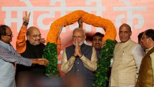 India’s Prime Minister Narendra Modi in his victory speech after his party won a historic mandate for a consecutive second term, in New Delhi on May 23.