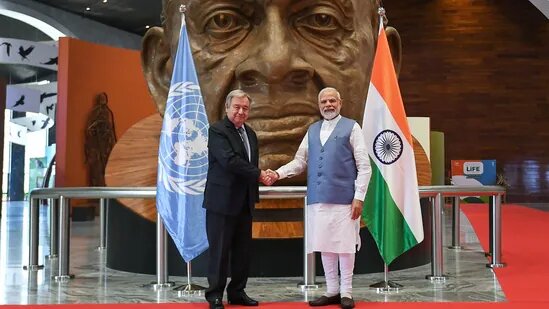 During his trip to Gujarat, Mr. Guterres visited Modhera Sun Temple near Ahmedabad where the entire village draws the power from solar panels installed in the temple campus as well as on the rooftops of the houses and the government offices.