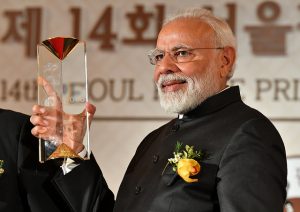 Prime Minister Narendra Modi has become the 14 recipient of the Seoul Peace Prize, and he is in distinguished company, with the prize being conferred earlier on world statesman like German Chancellor Angela Markel and former UN Secretary General Ban ki-Moon.Applauding the role played by Mr Modi for boosting the Indian and global economy, the Award committee lauded “Modinomics” and recognized his efforts to bridge the gap between the rich and the poor in society.