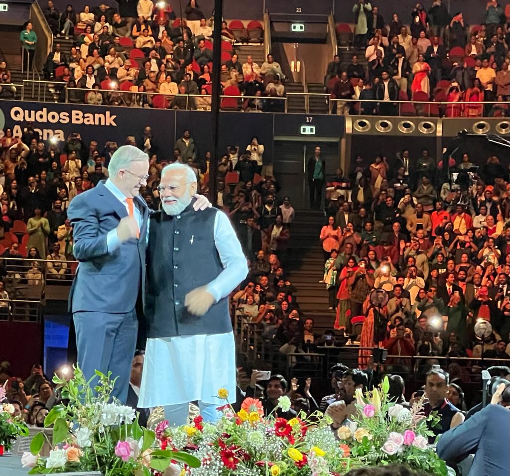 More than 20,000 Persons of Indian Origin, who have made Australia their home, turned up to listen to their idol at the Qudos Bank Arena, giving the leader of the world’s largest democracy a rockstar aura. Australian Prime Minister Anthony Albanese, who is not quite known for his oratory, waxed eloquent and showered praise on PM Modi, telling him in full public view that even the legendary singer Bruce Springsteen did not get the kind of welcome the Indian leader got on a wintry evening in Sydney. He called PM Modi the “Boss,” eliciting thunderous applause from the Indian community.