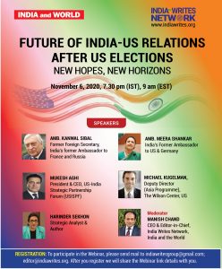 Organised by India Writes Network, India and the World magazine & The Global India Insights (TGII), the Webinar entitled, “India-US Relations after the US Elections: New Hopes, New Horizons” will explore the contours of the India-US relations, famously described by President Obama as “the defining partnership of the 21st Century,” under the new US administration which will take charge in January 2021.